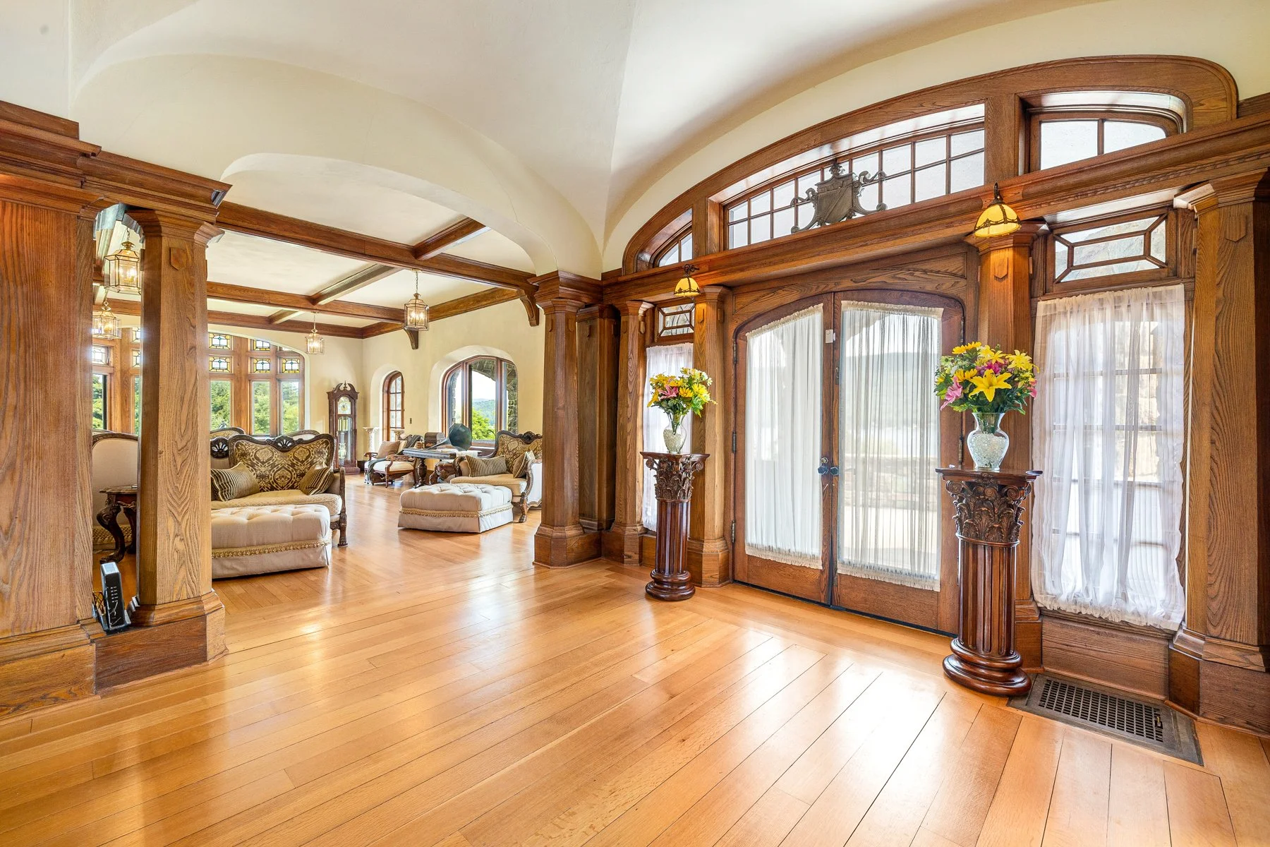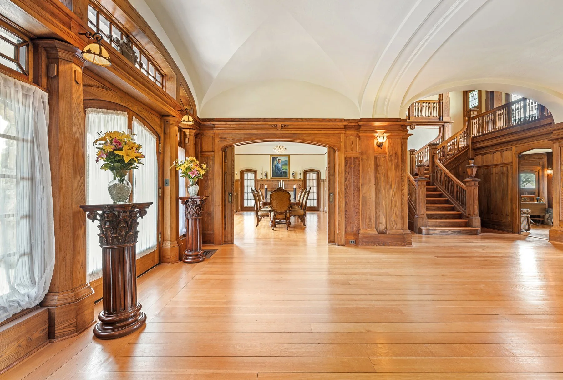 Evaley’s grand foyer exudes timeless elegance with rich chestnut wood paneling, soaring barrel-vaulted ceilings, and gleaming hardwood floors. Sunlight streams through leaded-glass windows, illuminating intricate craftsmanship and stately architectural details, creating a warm and sophisticated welcome.