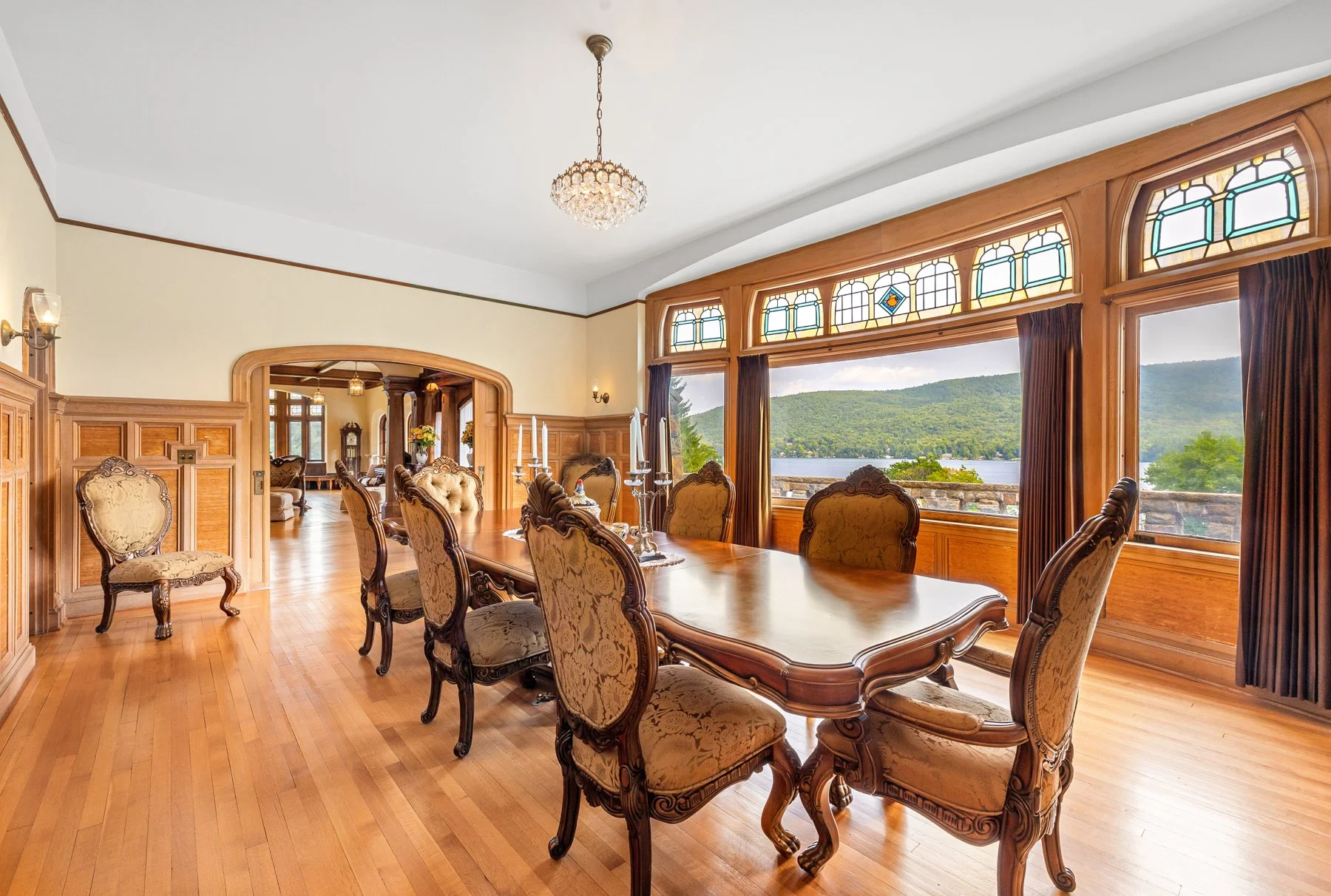 The dining room at Evaley is a masterpiece of sophistication, designed to host both intimate gatherings and grand celebrations. The space is framed by exquisite wainscoting and enhanced by charming pocket doors, while stained glass windows bathe the room in vibrant hues, creating a unique and inviting ambiance.