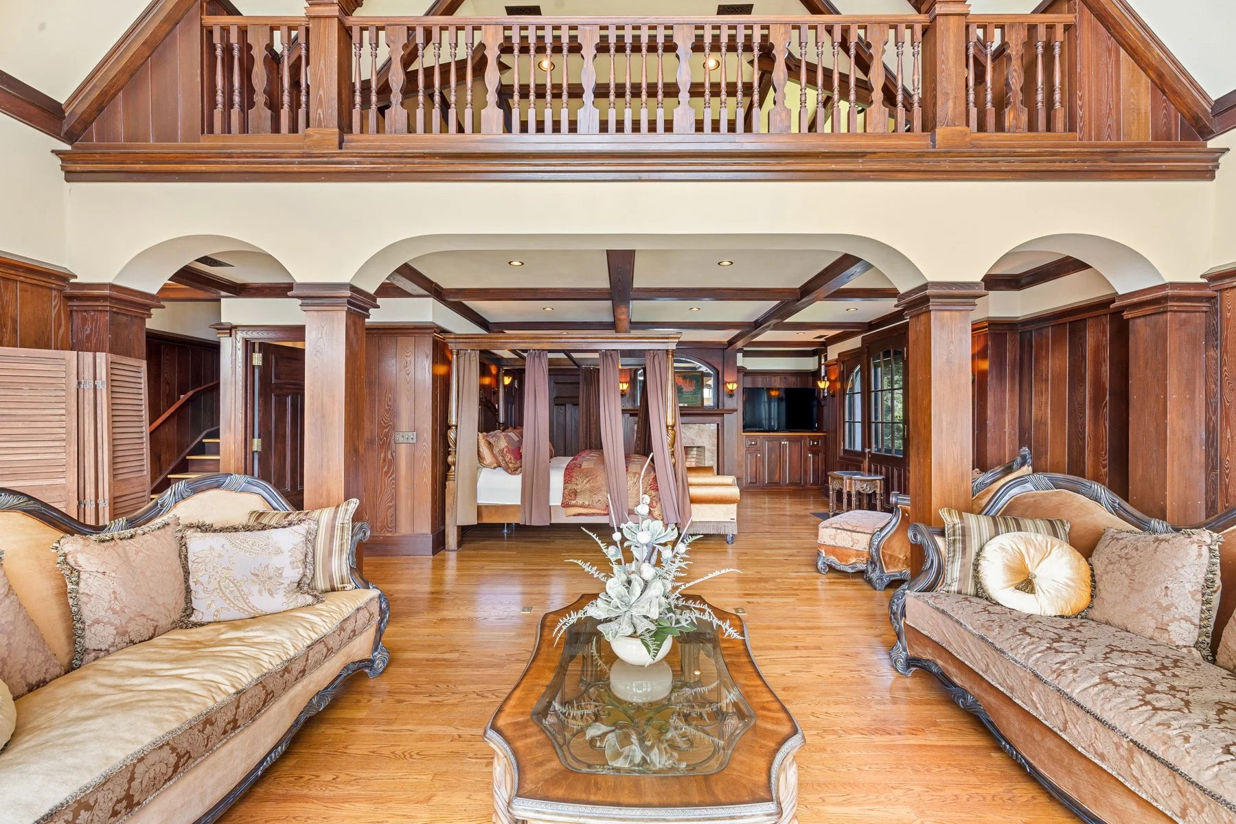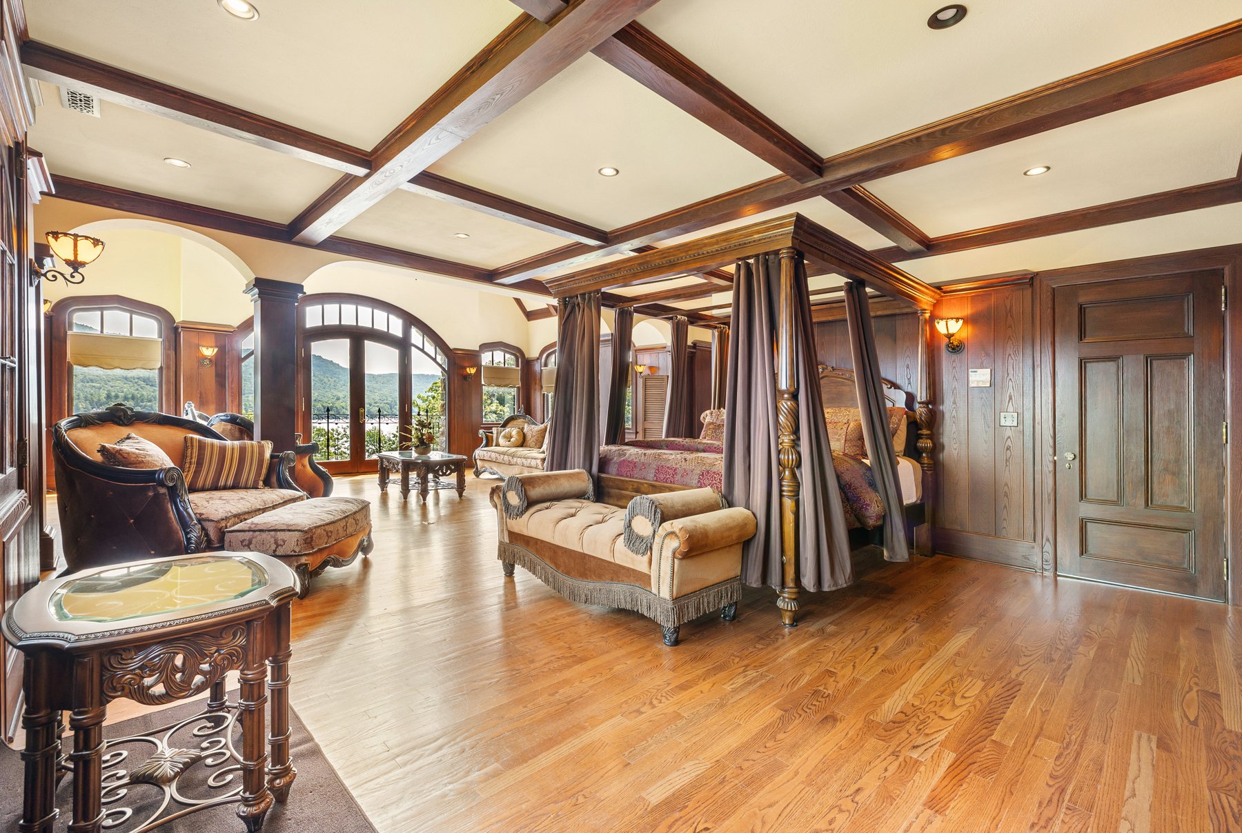 The primary bedroom is a luxurious retreat designed for ultimate relaxation. This private sanctuary features a spacious balcony that offers stunning views of Lake George and the surrounding pine-strewn mountains. With its blend of historic charm and modern comforts, it’s a haven of tranquility and sophistication.