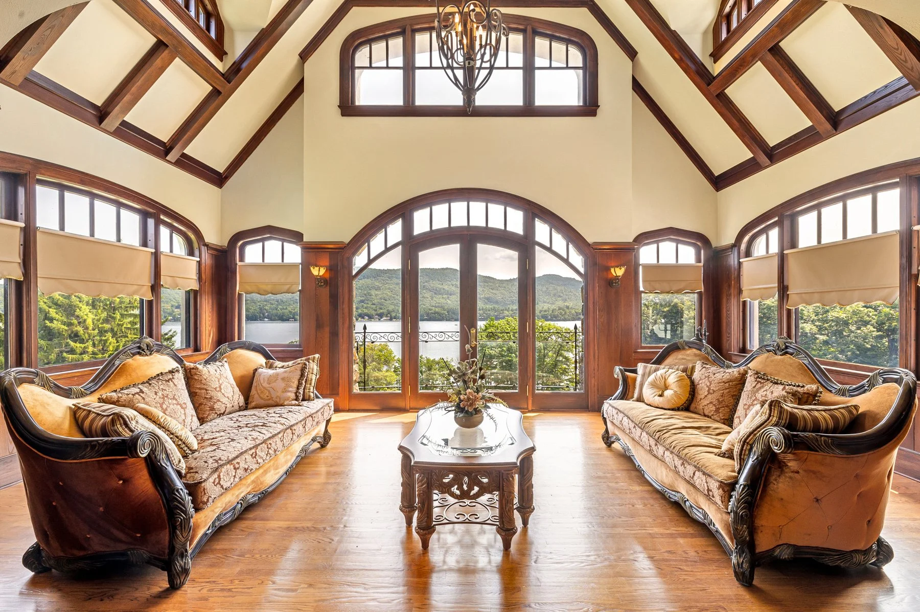Evaley’s outdoor spaces are nothing short of breathtaking. With 31.29 acres of pristine land and 470 feet of private shoreline, the estate offers unparalleled access to Lake George’s natural beauty. Enjoy tranquil mornings on the veranda, watch the sunrise over the lake, or take advantage of the mooring and dock access for endless water adventures. The Adirondack Mountains provide a stunning backdrop, adding to the estate’s serene charm.