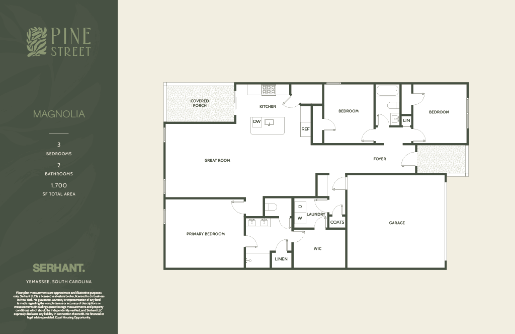 The Magnolia E is a thoughtfully designed single-story home offering 1,700 square feet, three bedrooms, and two full baths—where classic design meets effortless everyday living. A welcoming foyer opens into an expansive great room, creating a flexible space ideal for gathering, relaxing, and entertaining.